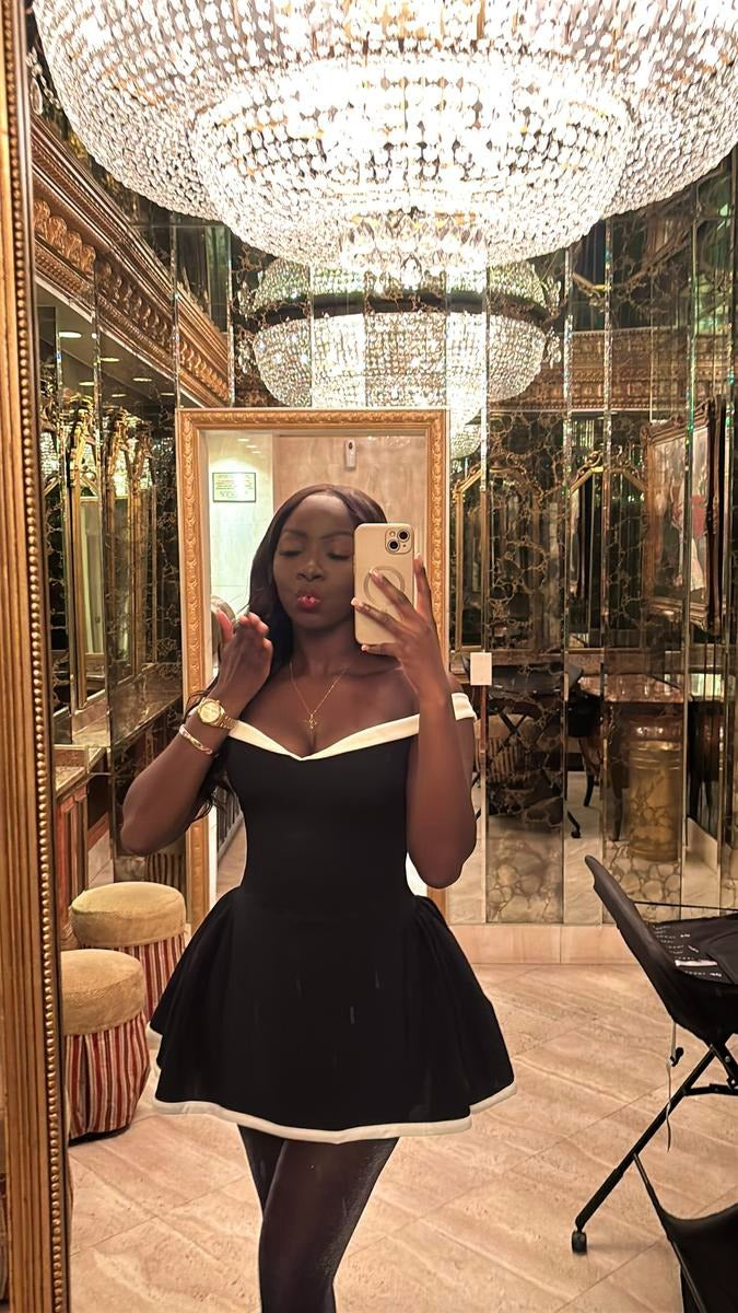 An elegant statement piece designed with a sculpted bodice and softly flared skirt for a refined silhouette. Crafted from a premium structured fabric with smooth lining, it features a striking contrast neckline that frames the shoulders beautifully. Polished, feminine, and effortlessly elevated.