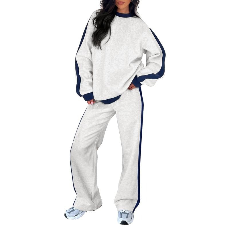 A refined two-piece lounge set designed with a relaxed sweatshirt and flowing wide-leg trousers for an effortlessly elevated look. Made from a premium cotton-blend fabric with a smooth, structured finish, it offers comfort without compromising on polish. Clean contrast panel detailing brings a modern, understated edge suited to everyday wear.