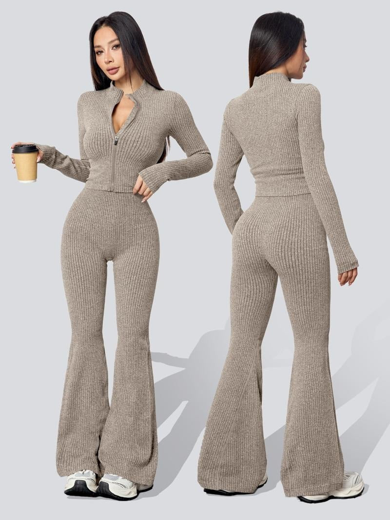 A refined two-piece set designed with a sleek, body-contouring fit and a clean, modern finish. Crafted from a premium ribbed stretch knit, it pairs a fitted long-sleeve top with sculpting flare-leg pants for a balanced, elevated silhouette. Effortless comfort meets understated polish.