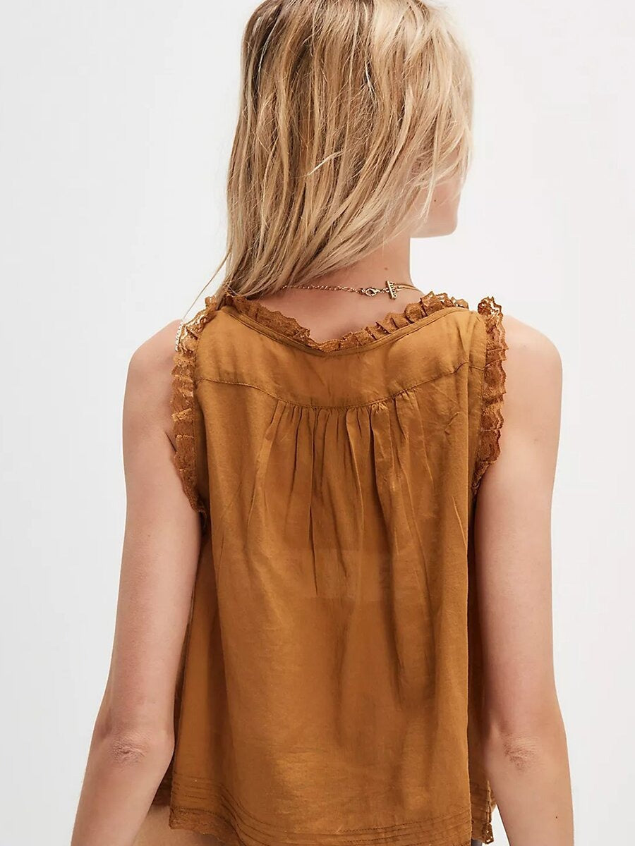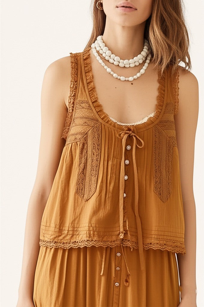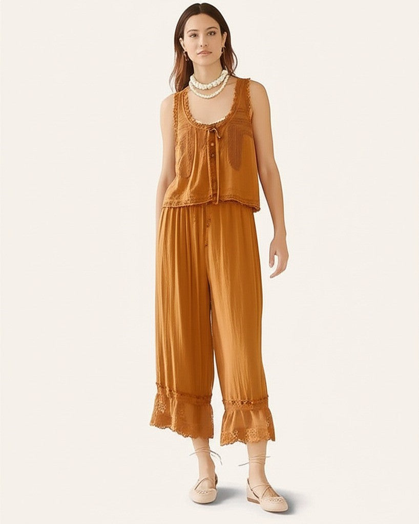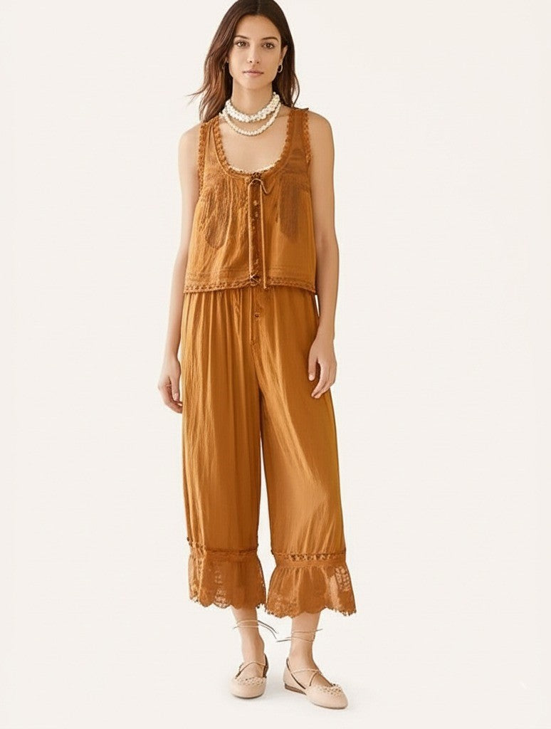 This lace-trimmed cotton set blends airy softness with vintage-inspired charm, giving you an effortlessly romantic look that’s still easy to wear. The flowing wide-leg pants and delicate tie-front top create a silhouette that feels light, playful, and quietly feminine. It’s a breezy, beautiful pairing made for days when you want comfort with a touch of whimsy.