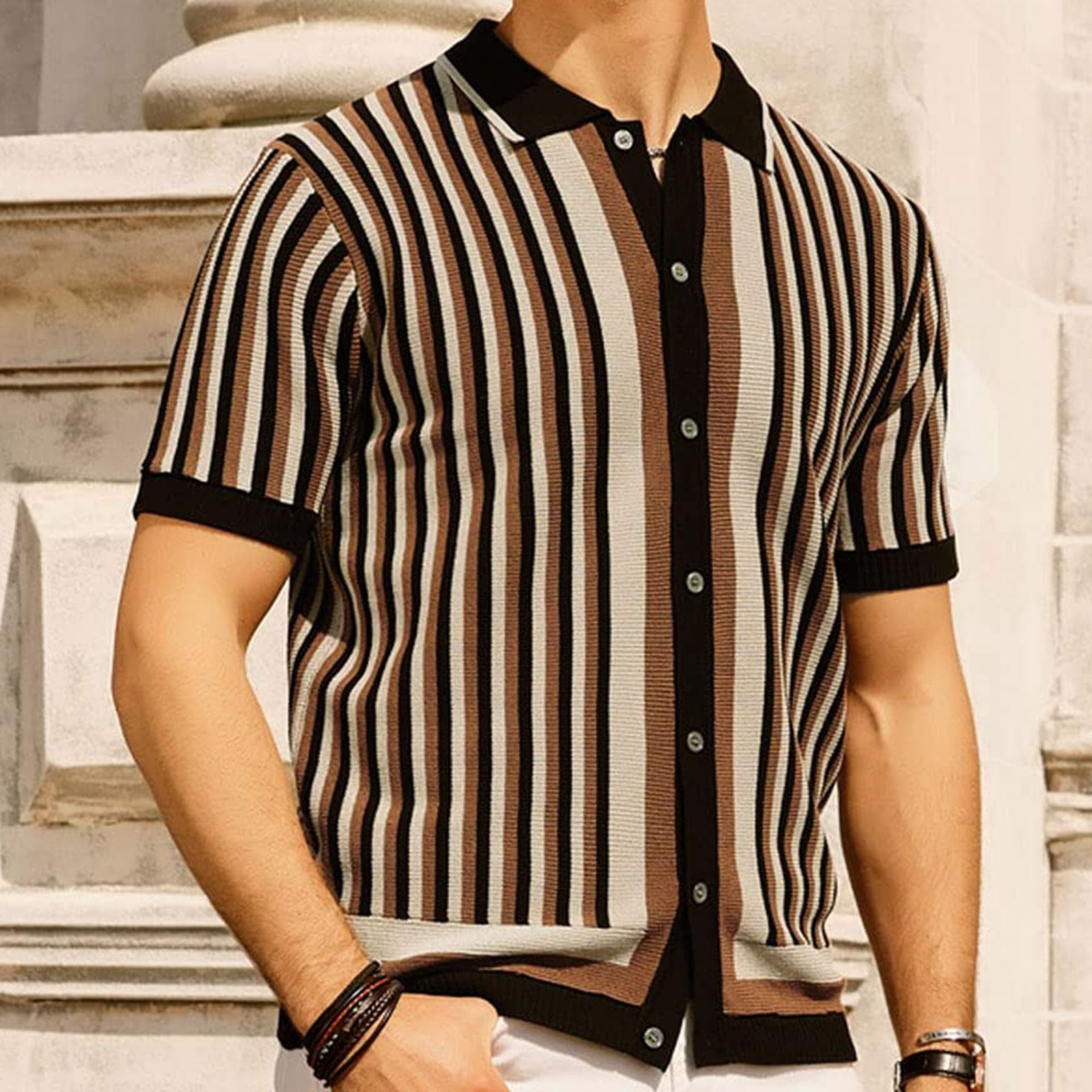 Woven from a soft cotton blend, this striped button-up shirt combines casual ease with a refined touch. Its moisture-wicking fabric keeps you comfortable, while the relaxed collar and bold stripes add timeless style. Designed to fit true to size for effortless wear.